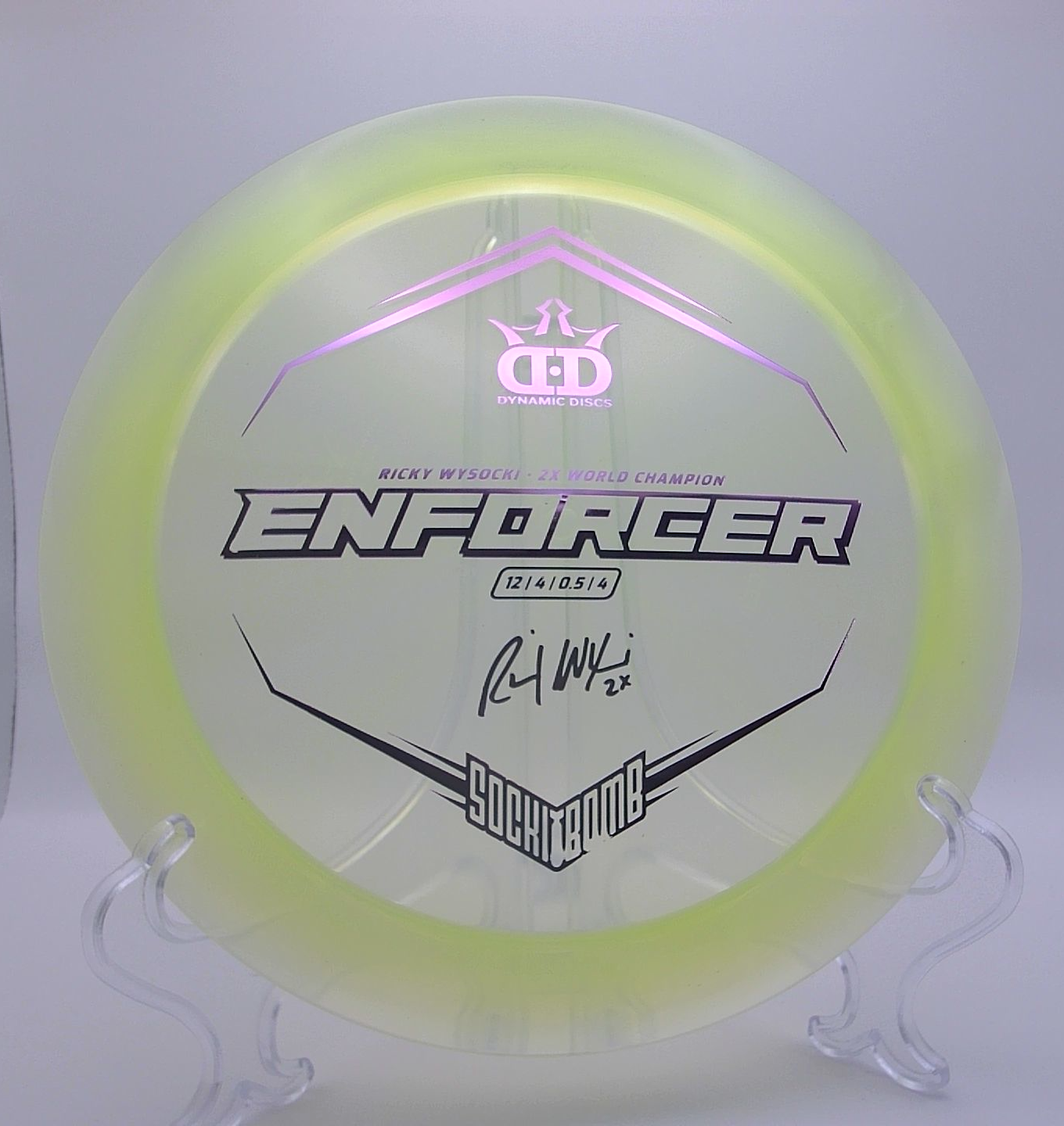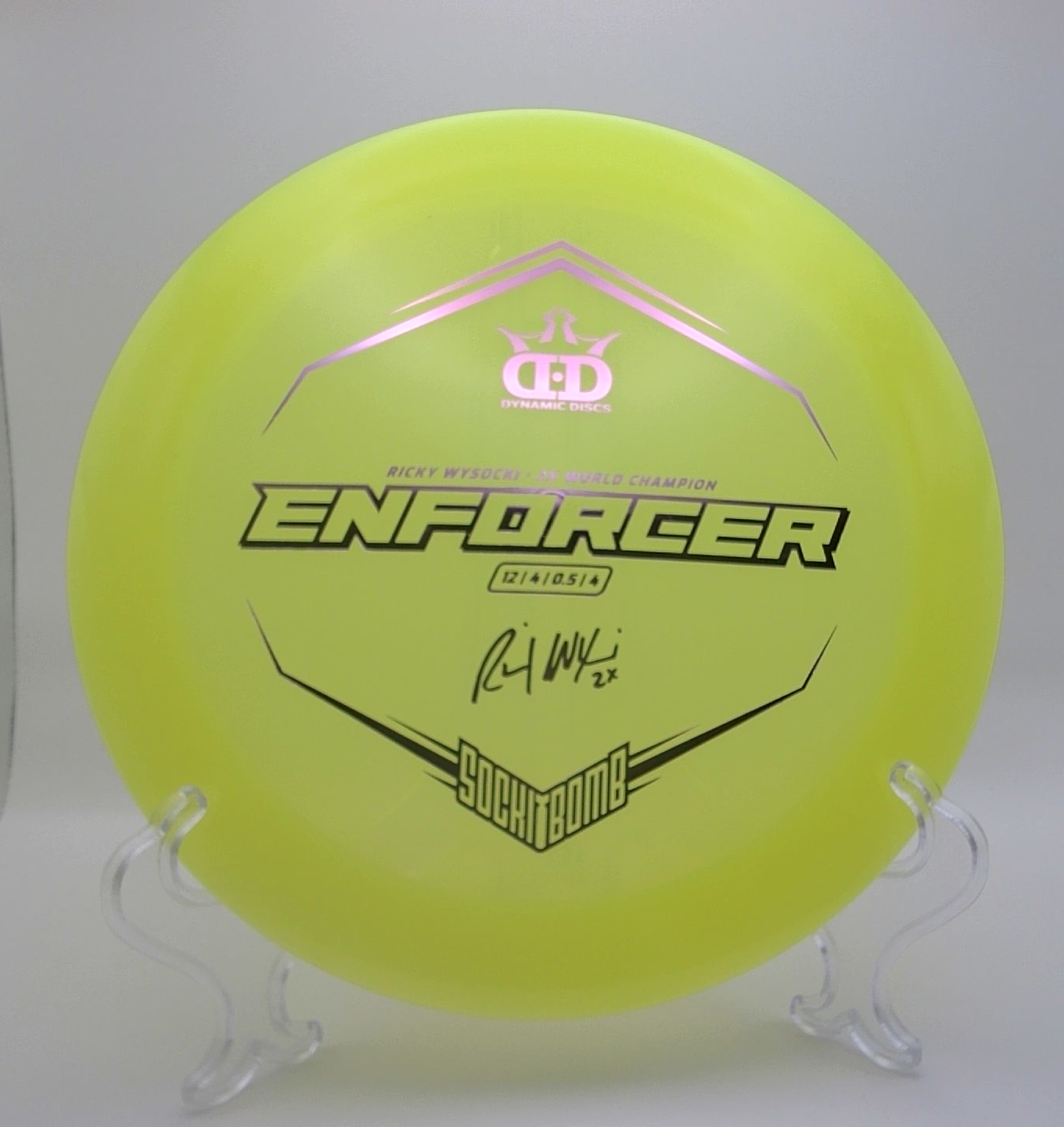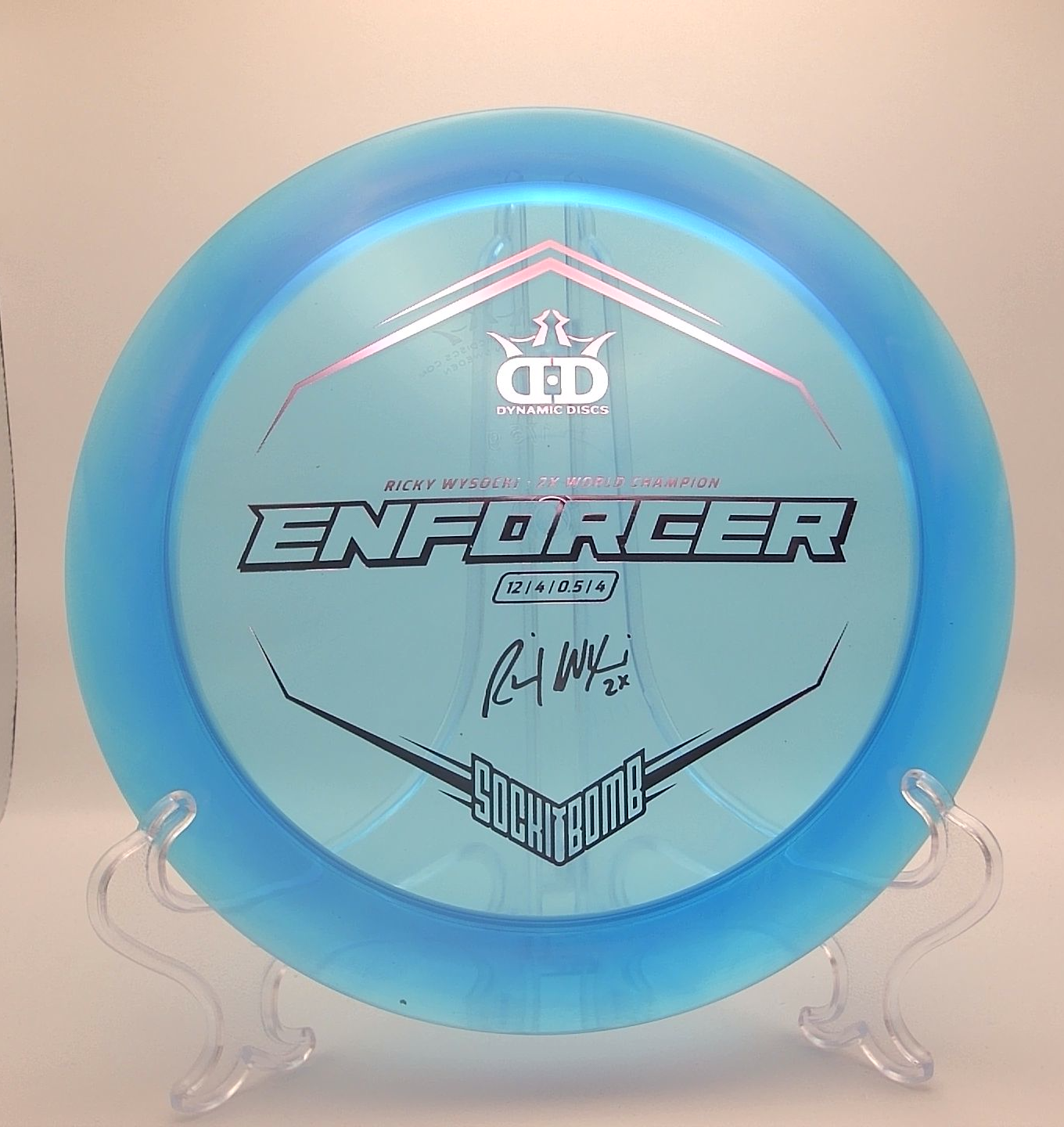 You no longer need to make a choice. You don't have to sacrifice distance in order to have stability. You don't have to fear flipping over when you need a big throw. The Enforcer mixes these two needs beautifully. It will fly great into a wind. It can be turned over for a very predictable S-flight. It is a wonderful disc for a spike shot. The versatility and predictability of the Enforcer has proven itself and is a staple in the bags of many world class professionals.